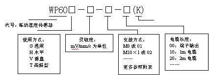 表示:WP60振動速度傳感器,水平方向安裝,靈敏度20mV/mm/s,M10×1雙頭螺栓安裝,接頭輸出,不帶電纜鎧裝。